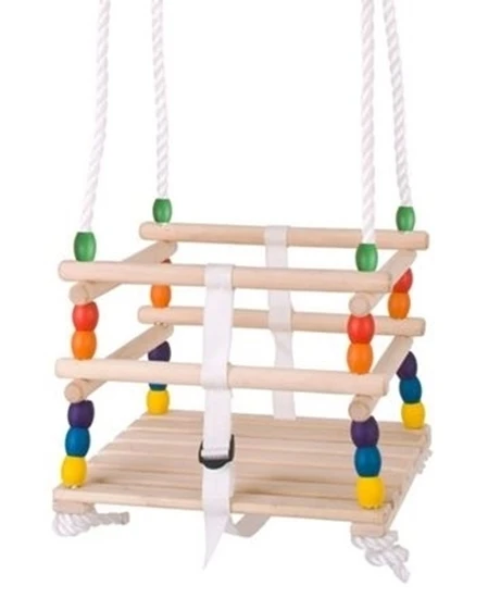 Wie kent ‘m niet? Deze houten peuterschommel met vrolijk gekleurde kralen is in hoogte verstelbaar middels verstelschalmen. Afm. zitvlak 30 x 30 cm. Max. gebruikersgewicht 25 kg.