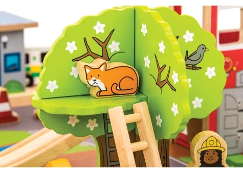 Er is brand in de stad! Ga er snel heen met de brandweertrein, brandweerwagen of brandweerhelikopter, zodat de dappere brandweerlieden de brand kunnen blussen. De rails gaat over de hele tafel heen. Natuurlijk kun je de speeltafel ook voor andere doeleinden gebruiken.