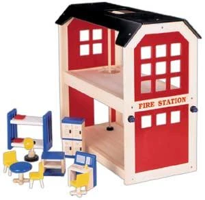 Stoere brandweerkazerne inclusief meubeltjes zoals een tafeltje met 2 stoeltjes, een draaistoel, 4 kluisjes, 1 stapelbed, 1 kastje en een controle unit. Afm.: L64 x D31 x H56 cm.
