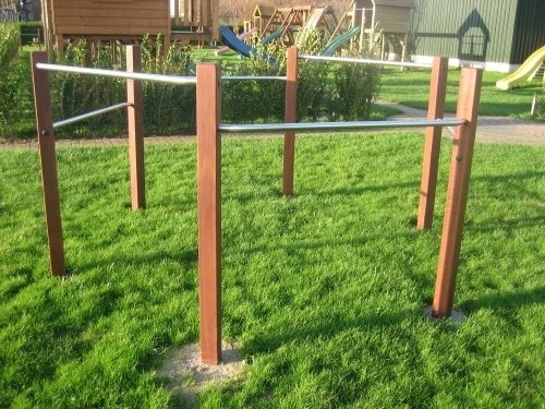 Het zeskantig duikelrek, bestaat uit 6 hardhouten palen en 6 RVS duikelstangen.