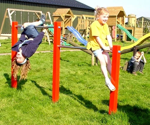 Dit duikelrek bestaat uit verticale, zwaar uitgevoerde thermisch verzinkte en gepoedercoate staanders met daartussen 2 rvs duikelstangen voor een optimale gladde draaibeweging. De staanders zijn standaard gepoedercoat in de kleur rood en dienen gebetonneerd te worden. Een zeer solide en onderhoudsarm speeltoestel voor vele jaren plezier.