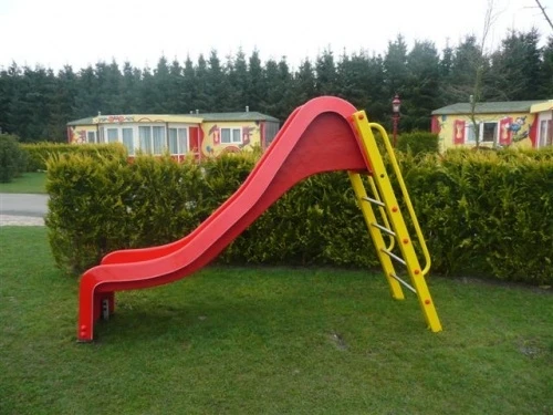 Polyester glijbaan met verzinkte en gepoedercoate stalen trap met RVS sporten. Kan zelf met beton gestort worden, maar desgewenst is ook een prefab betonpoerenset leverbaar.