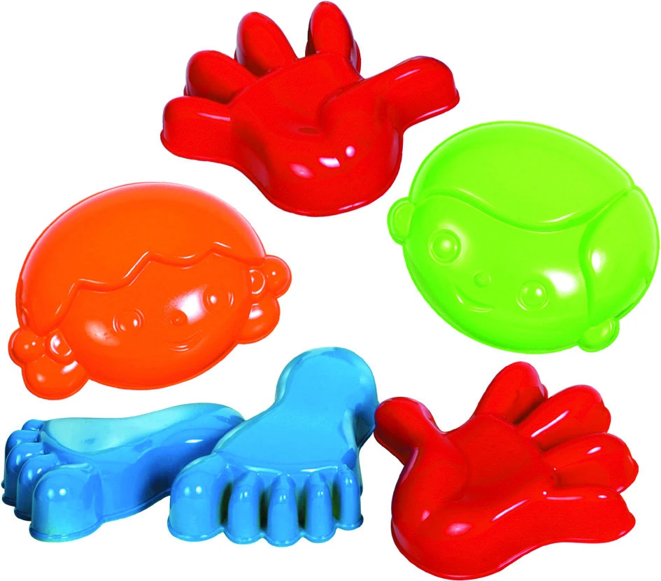 Set van 6 vormpjes voor in de zandbak van het merk Gowi. Een gezichtje van een jongen en van een meisje, 2 handen en 2 voeten. De set is gemaakt uit hoogwaardige en veilige materialen.