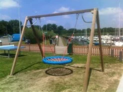 Hardhouten frame met vogelnestschommel met een diameter van 120 cm.
