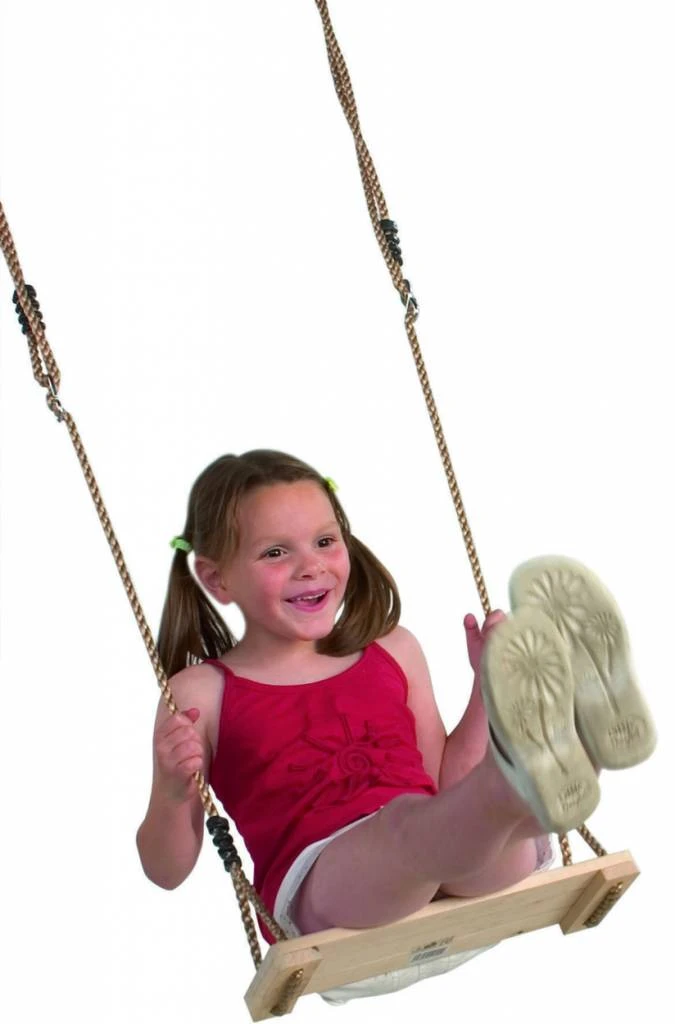 Schommelzitje uit geimpregneerd hout. Het zitje is geschroefd met RVS parkers, de 10 mm. PolyPropyleen touwenset is in lengte verstelbaar middels gegalvaniseerde stelachten.