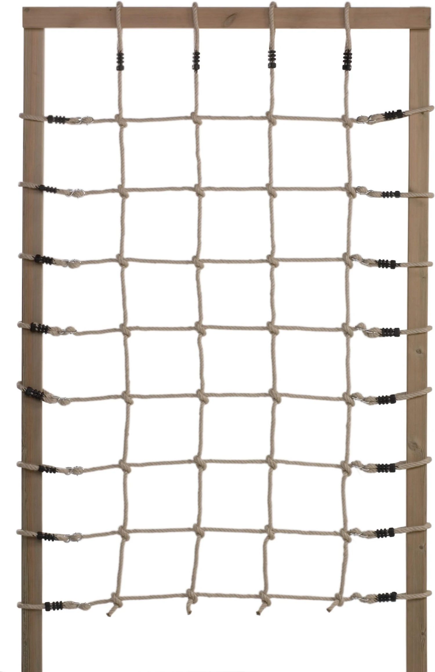Klimnet van polyhemp touw met afmetingen 125 x 200 cm. Gemakkelijk te bevestigen en te spannen door gegalvaniseerde stelachten.