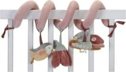 Kijk, voel en ontdek! Deze leuke en vermakelijke activiteitenspiraal zal baby’s zowel thuis als onderweg bezighouden. Bevestig dit praktische speelgoed eenvoudig aan alles van wieg tot box of autostoeltje. Het versterkt de zintuigen en stimuleert de hand-oog coördinatie. De activiteitenspiraal is gemaakt van corduroy met katoen en draait om een klein vogeltje, een kleurrijke vlinder en een fascinerende bloem die een ratelend geluid maakt.
