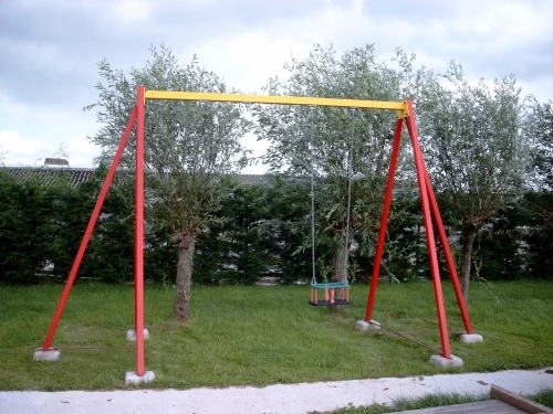Een zeer solide schommel bestaande uit 6 staanders van thermisch verzinkt staal en daarna in kleur gepoedercoat, met 4 schommelhaken. Incl. 2 x rubber zitting.