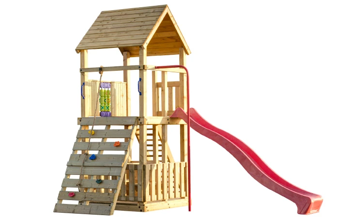 (de afgebeelde picknickset onderin de toren en de glijbaan zijn optioneel)