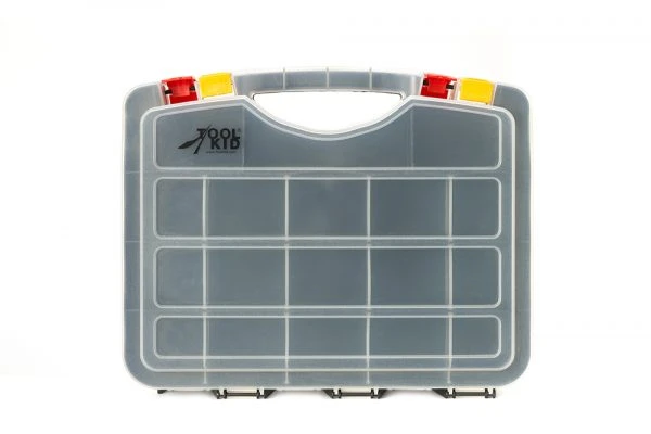 Het ene gedeelte is voorzien van rode sluitingen, het andere van gele zodat duidelijk is welke kant geopend kan worden. De vakken kunnen zelf ingedeeld worden met de meegeleverde schotjes. Wat bijvoorbeeld handig is voor het opbergen van de figuurzaagjes die wat langer zijn.