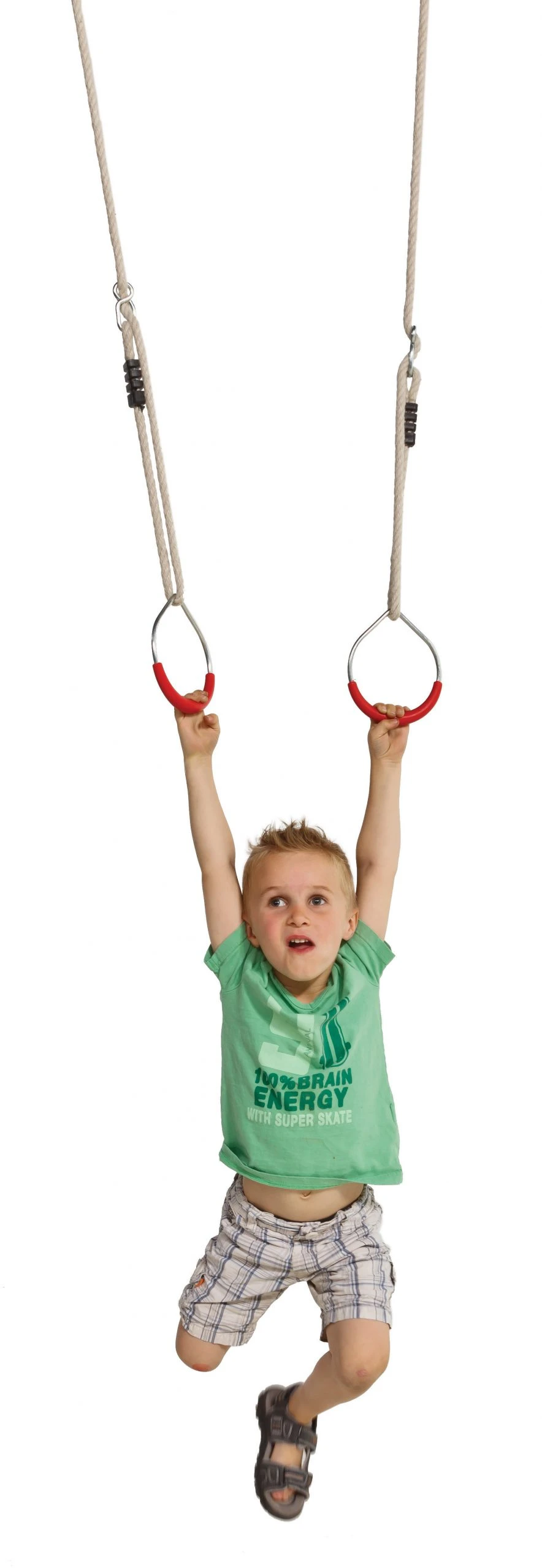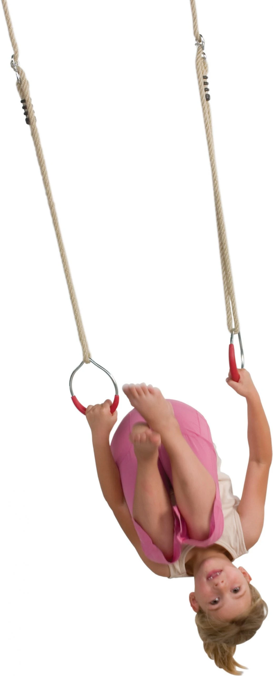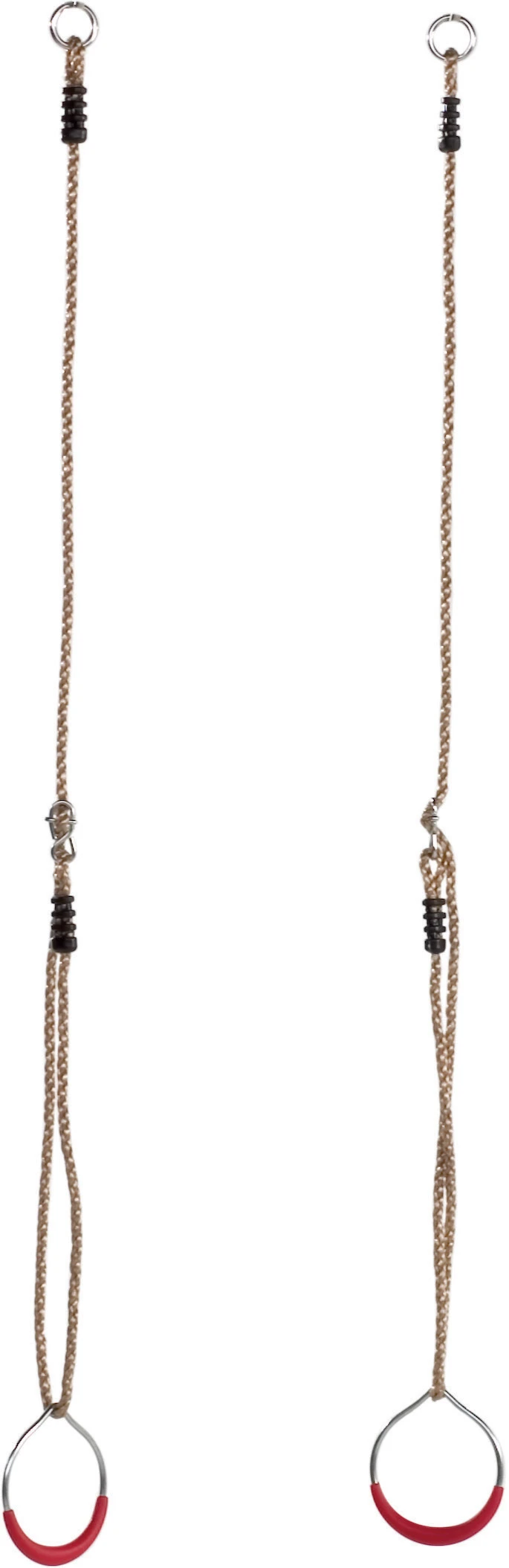 Metalen turnringen met een rood kunststof handgreep. De ringen hebben een diameter van 12 cm. De ringenset wordt geleverd incl. de 12 mm. PH-touwenset, welke voorzien zijn van gegalvaniseerde stelachten en ophangogen en de touwverbindingen zijn uitgevoerd met kunststof lassen.