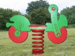Veerelement op stevige 20 cm. veer, uitgevoerd in motor-figuur. Motor uitgevoerd in HMPE en daarmee zeer onderhoudarm.